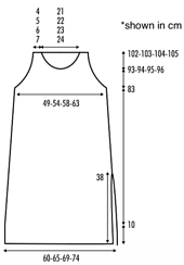 Garment is crocheted as a back piece and a front piece. Pieces are seamed together as indicated in schematic, then collar and armhole edging added.