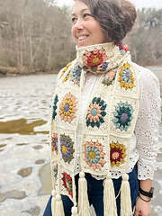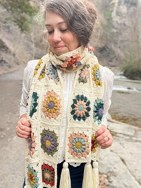 The granny square scarf construction makes this project easy to pick up and put down, making it perfect for busy days, travel, or winding down in the evening.