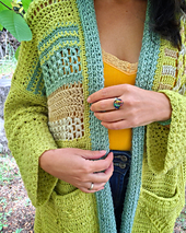 CARDI ANANSI está pensado para tejedoras con un nivel intermedio en adelante, o para quienes ya tienen manejo de los puntos básicos y ganas de enfrentarse a una prenda con más capas de construcción y composición.
