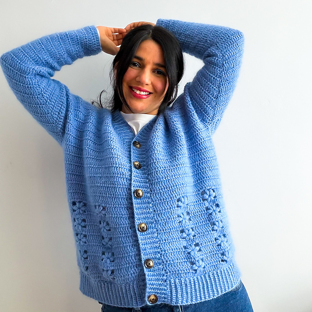 Create something beautiful with the Azalea Cardigan Pattern, a crochet design that looks special without feeling overwhelming to make. This downloadable PDF pattern is written for advanced beginners and confident beginners and includes clear, step-by-step instructions to help you crochet your cardigan with confidence in sizes XS to XXL. The design features a timeless V-neck, a classic button-up front, and gorgeous flower stitch details that add a delicate, feminine touch to the sleeves and body.