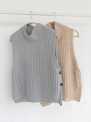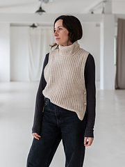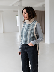 The Flow Slipover consists of a front and back panels, worked vertically in turned rows. The front and back are then joined at the shoulder seams. Next, the bands with buttons and buttonholes are added along the sides, and finally the collar is worked around the neck opening.