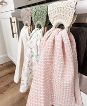 Two panels are worked around wooden rings and then joined to create a sturdy fold-over towel holder that easily slips over a handle or bar to keep towels securely in place.