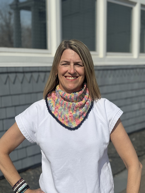 This bandana is beginner friendly and can be adjusted for size as desired. Our sample shown used approximately 1/2 the yarn in the kit so around 200 yds of the MC and 50 yds of the CC.
