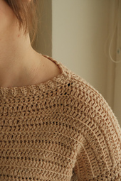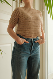 The tee is worked flat in double crochet through the back loop only. This gives it a beautiful ribbed texture that looks way more complicated than it is. Everything gets sewn together and finished with a neat ribbed neckline.