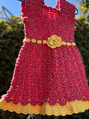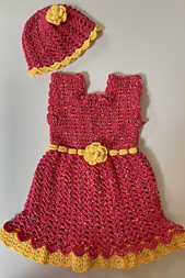 The Sunny Baby Dress Set is a bright, cheerful crochet ensemble designed to make little ones shine. Featuring a sweet sleeveless dress with a textured bodice, flared shell-stitch skirt, scalloped ruffle trim, and a charming rose-accented belt, this set is full of thoughtful details. The coordinating sun hat completes the look with matching shell texture and a playful flower embellishment. Made with [KnitPal Tweed Twinkles DK yarn][1]—or [Cotton to the Core DK][2] as an alternative—this easy-level pattern is perfect for warm-weather outings, special occasions, or heartfelt handmade gifts.