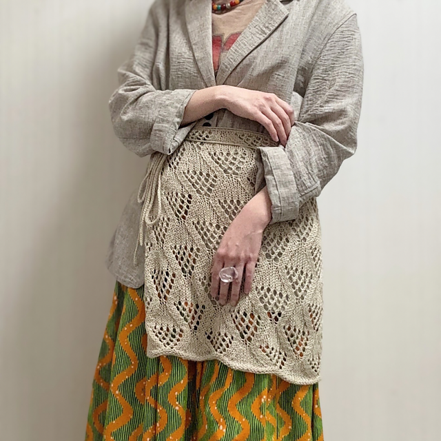 羽のような透かし模様をあしらったラップスカートをデザインしました。季節問わず、気軽におしゃれを楽しめる1枚になりますように。