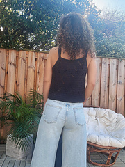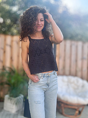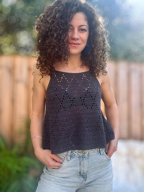 The Evening Mist Top is a lightweight lace crochet top featuring a delicate diamond stitch pattern.