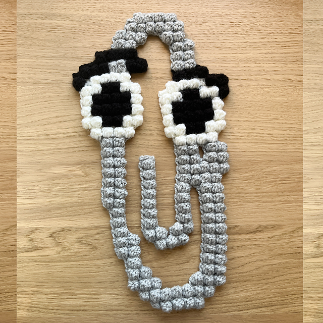 A Clippy-inspired crochet project with a mix of textured and shaping techniques. Using a 4 mm hook and acrylic yarn, the finished piece measures approximately 38 cm × 18 cm / 15 in × 7.1 in. The final size can vary depending on your yarn, tension, and hook choice.