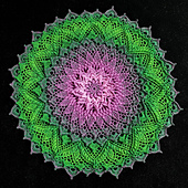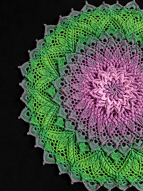 Your tension will determine things like hook size, yardage, finished size, and height of stitches. Any of these things can be adjusted as needed. Using recommended thread and hook this pattern will use minimum 420 yards /400 metres of thread. And your finished doily will be about 14.5” / 37 cm in diameter.
