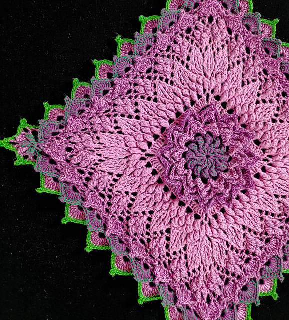 Your tension will determine things like hook size, yardage, finished size, and height of stitches. Any of these things can be adjusted as needed. Using recommended thread and hook this pattern will use minimum 370 yards / 350 metres of thread. And your finished doily will be about 10x10” / 25 x 25 cm.