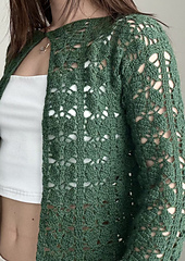 This pattern is a lace leaf crochet cardigan available for sizes XS-XXL. The pattern has about 2-4 inches of positive ease to ensure you can easily layer it.