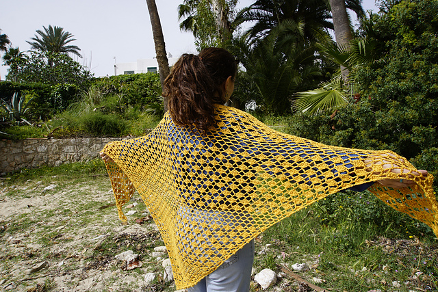 Chal Arena is a lightweight triangular crochet shawl inspired by the warm tones of Mediterranean sand and the gentle movement of the sea.