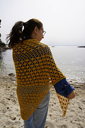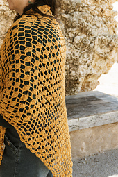 Chal Arena es un chal triangular ligero de crochet inspirado en los tonos cálidos de la arena del Mediterráneo y el movimiento suave del mar.