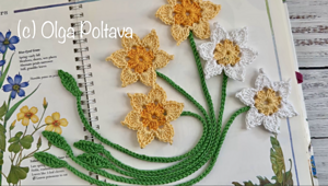 This is a crochet PATTERN and a VIDEO TUTORIAL for a daffodil (narcissus) bookmark, worked with hook size D (3.25 mm) and 100% mercerized cotton yarn category 2. Specifically I used YarnArt Begonia. Another option is 100% mercerized cotton thread size 3.