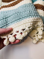 Inspired by the sand dunes of Camber Sands Beach, this blanket is crocheted in soothing shades of light teal, soft brown, and off-white. The design features colorful stripes worked in a herringbone stitch to create a beautiful textured effect. For a "super cute" finishing touch, the blanket is completed with a row of pretty pom-poms across each end. The pattern includes a size chart with six options, making it versatile enough for any space or occasion, from a small stroller blanket to a twin-sized bedspread.
