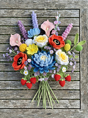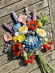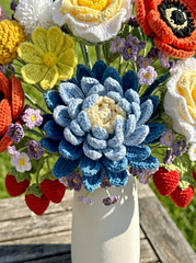 Includes multiple crochet flower patterns and filler elements to create a complete bouquet for gift, decor, or wedding use.