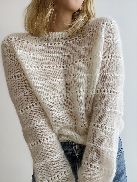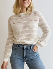 The sweater is worked in stockinette stitch alternated by a beautiful textured lace pattern with raglan increases top down in one piece. First, the body is worked back and forth in rows to shape the round neck. Therefore, increases are worked in right side rows and wrong side rows to shape a saddle shoulder (and the round neck, of course). Then, the sweater is worked in the round with sleeve and round neck increases only. Afterwards, there are classic raglan increases, until the sleeves are separated from the body. The body is then finished in stockinette stitch alternated by the beautiful textured lace pattern in the round and with a hem in 1x1 half twisted ribbing with twisted knit stitches. The sleeve stitches are picked up again and the sleeves are finished in stockinette stitch and in the beautiful textured lace pattern in the round and with cuffs in 1x1 ribbing with twisted knit stitches. Last but not least, stitches around the round neckline are picked up and a double folded collar is worked in 1x1 ribbing with twisted knit stitches. The beautiful textured lace pattern, which covers body and sleeves, is emphasized by using different yarn qualities: 2 strands of Tilia for the stockinette stitch part and 1 strand of Tilia held together with 1 strand of Arwetta for the textured lace pattern. The combination of Tilia and Arwetta is used for the half twisted ribbing of collar, cuffs and hem as well. The fit of the sweater is fitted around the shoulders, but looser around bust and waist. The sleeves are again relatively fitted around the upper arm and flow straight into the ribbed pattern of the cuffs, but straight and without any shaping.