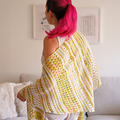 The shawl combines garter stitch with airy lace into a delightfully entertaining knit of the best "just one more row" kind. Two halves of the shawl mirror each other with colors inverted - an approach that allows to use up all available yarn from both skeins and to adjust the pattern to available yardage. The lace pattern is **both written out row-by-row and charted**, with video support included.