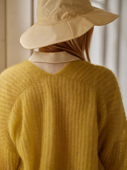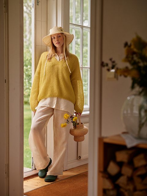 Isabell is an ultralight, relaxed, V-neck brioche sweater to wear on a chilly summer day or night. Throw it over a swimsuit or a summer dress to give some extra warmth. Using single strand of silk-mohair yarn makes this garment weigh almost nothing! The inspiration for Isabell came from the yarn: Sara Markkula wanted to experiment with the texture that results from using a single strand of silk-mohair for brioche stitches. The squishy, fluffy but airy net-like texture felt a perfect combination for a summer garment. The garment’s name is based on one of her beloved relatives; Sara tends to name her designs after her family tree.