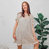 This pattern guides you through crocheting two identical granny square panels, then assembling them into a relaxed summer dress with decorative ruffle edging at the hem and sleeves. No size chart needed — the instructions adapt to your own body measurements.