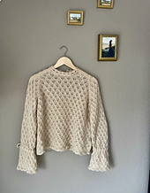 Blusen er konstrueret nedefra og op, hvilket giver dig god kontrol over længden på både krop og ærmer undervejs. Som en unik designdetalje afsluttes blusen med hæklede kanter, der giver et skarpt og moderne udtryk, som man sjældent ser i klassisk håndstrik.