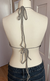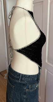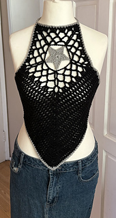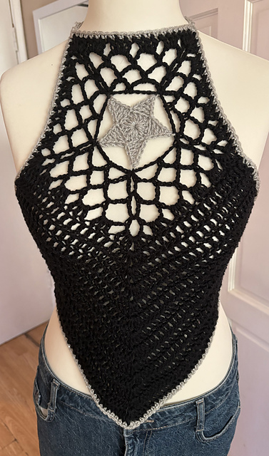 This crochet pattern is for a lacy tie up halter neck vest featuring lacy detail and a star motif. It is a one size fits most (UK 8-18) that can be easily modified to make a smaller of larger sized vest.