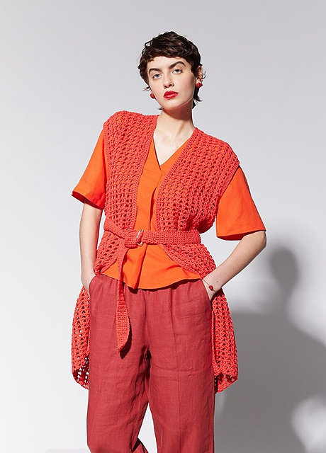 Layering im Sommer? Mit dieser langen Häkel-Weste geht das ganz leicht und luftig – und unheimlich lässig! Sie hat einen cleanen Schnitt und ein grafisches V-Stäb chen-Muster. Toll: Das warme Rot des Leinengarns harmoniert sowohl mit kräftigen Orange- als auch mit dunkleren Rottönen. .*.. burda stricken 02/2026*