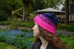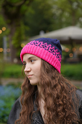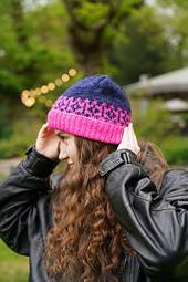 Sample shown was knit in Color Wheel Yarns DK in Midnight (MC) and Lipstick (CC).