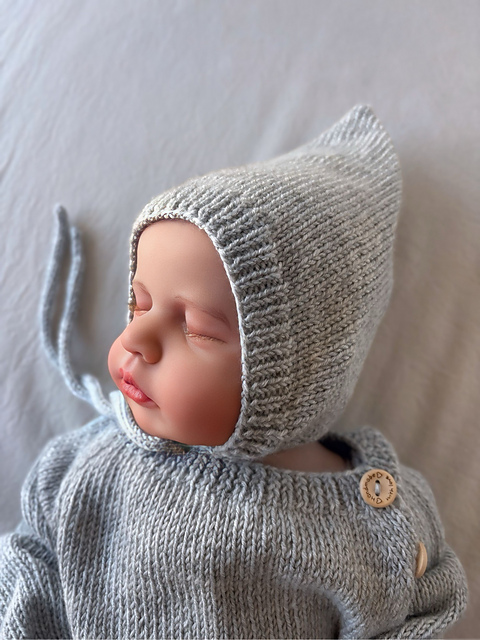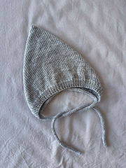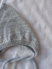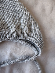The back of the bonnet is shaped with German Short Rows and is then closed using Kitchener stitch. An attached i-cord edging is worked along the lower edge of the neck and finishes in two tie strings.