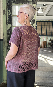 The sample shown uses a fingering-weight silk/linen blend single. The fiber blend provides a nice balance of drape and body. A solid color (as opposed to a variegated yarn) will work best with the lace panel patterns, though a subtle tonal color could work well. (As always, make a swatch to ensure that you like the look of the fabric as well as to meet gauge!)