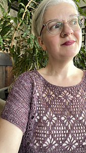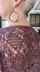 This crocheted top begins with lace panels for the back and front. Then, after joining the shoulders, the sides of the top are worked in double crochet along the sides of the panels, with easy shaping at the shoulder line. Side seams for the body are created with slip stitches, and short sleeves are worked in turned rounds. A few rounds of single crochet trim the neck and hem edges.