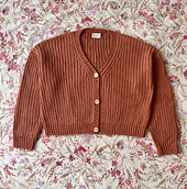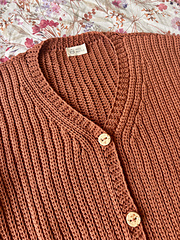 The cardigan is made up of four separate panels: two front panels, a back panel, and sleeves. Once completed, the pieces are joined together and finished with a ribbed-style edging, where the buttons are sewn.
