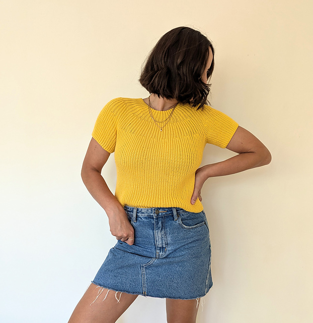 The yoke is created with short rows and the sleeves and front/back panel are joined as you go. This means that the end result is almost a fully closed tee, which requires minimal sewing to complete. Other features include a lower neckline at the front, two body lengths and two sleeve lengths (short and mid-length).