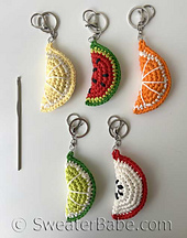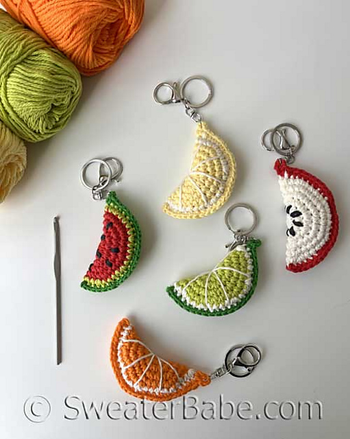 Crochet a whimsical fruit charm to decorate your bag or use as a cheerful keychain! Instructions included for crocheting a watermelon, lemon, lime, orange, and apple.