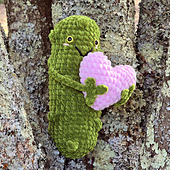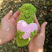 This crocheted positive pickle is approximately 18 cm (7 inches) tall by 6 cm (2.4 inches) wide.