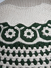 The yoke is formed in moss stitch, followed by a structured round where floral motifs are attached as you work. The body continues with a simple repeating pattern, allowing you to customise the length.