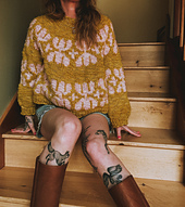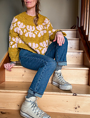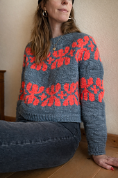 Splot is knit from the top down in the round featuring short row shaping for the back neck and a bold motif on the yoke, body and sleeves.