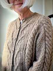 The cardigan is worked top down. After the establishment row, new stitches are cast on at each end of the row to shape the neckline. Simultaneously, raglan increases are worked on all right side rows. Raglan increases continue on the yoke. The cable pattern is worked
