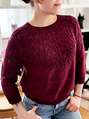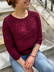 Vinelia is a top-down seamless sweater with a ribbed neckline that opens into a lace yoke, a leaf pattern that's intricate to look at but easy to knit.