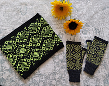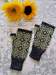 Inspired by an online community project, these colourwork mitts feature stylized sunflower motifs. I wanted to play with the idea of abstracted sunflowers, with a strong contrast, and chose neon yellow and black to symbolize the importance of finding joy, and cultivating your inner light, in the presence of darkness. The matching cowl can be found here: https://www.ravelry.com/patterns/library/geometric-sunflower-cowl