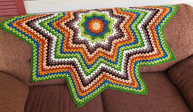 If you're looking for an easy blanket pattern that isn't a yarn eater, this is it. This 9-Point V-Stitch Round Star Ripple Crochet Blanket works up into a lightweight blanket and is perfect for scrap yarn projects.