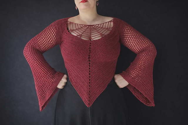 Create a bold, statement piece with this Spiderweb Crochet Top Pattern. This design features a striking web-style neckline, dramatic bell sleeves, and a flattering pointed hem—perfect for gothic, witchy, and boho wardrobes.