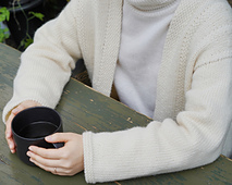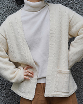 The Tour Cardigan is a lightweight, robe-style cardigan designed to be worn open without buttons. The button band features a woven stitch pattern, adding a sophisticated texture while providing structural stability to the fabric.