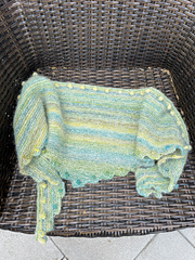 „BOBBLE BANDANA“ is a very beginner-friendly „knit-stitches-only“ pattern, there are no purl stitches. There are increases at both sides every few rows which make the wingspan grow fast. The increases make a nice zig-zag-edge when wearing. Every little “increase step” has a tiny bobble in its middle.