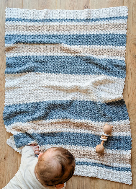 Create a beautiful, handmade baby blanket with the Coastal Baby Blanket crochet pattern. This easy striped design uses a simple one-row repeat, making it perfect for beginners or anyone looking for a relaxing, no-stress project. With its soft coastal color palette of blue, beige, and white, this blanket is ideal for baby showers, gifts, or your own little one.