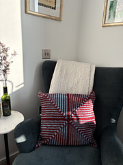 The Gathering Point Cushion is worked from four mitred squares, joined as you go to form a cross at the centre of the cushion front. Each square is shaped using centred decreases in stockinette stitch, creating clean diagonal lines towards the middle. A consistent two-row stripe is done across the entire cushion front.