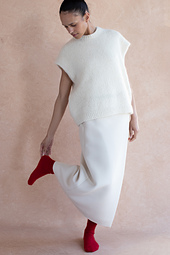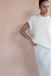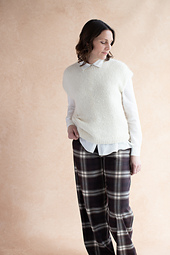 This is a sleeveless, drop shoulder style sweater vest, knitted top down. Start the shoulder slope for the back body, and continue to shape the armhole to the bottom of the armhole. Then pickup stitches for the front body to similarly knit as for the back body. After joining the front and the back body, continue knitting in the round to the hem. The neckband is knitted by picking up stitches from the neckline. The armholes are finished in rolled style to