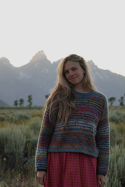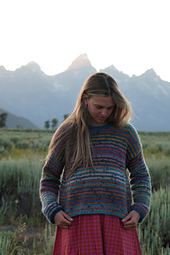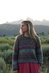 The Kida Sweater is worked top down. First, the upper back panel is worked in stockinette with shoulder shaping to underarm. Then, stitches are picked up for the front right and left shoulders, which are worked separately in stockinette. After both front shoulder panels are complete, stitches are cast on for the center front neckline, and the front panel is worked in stockinette to the underarm. After completing the front, the back and front panels are connected and then the body and sleeves are knit in the round. To finish, 1x1 ribbing is worked on all hems and the collar.