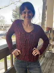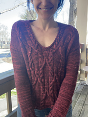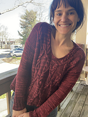 Bad Blood is worked in pieces and seamed. Short rows are worked for shoulder shaping. The shoulders are seamed using the horizontal seaming method. The sides are seamed using the Mattress Stitch method. Stitches are picked up around the armholes, and the sleeves are worked in the round outward from the body. The neckline is finished with an I-cord.