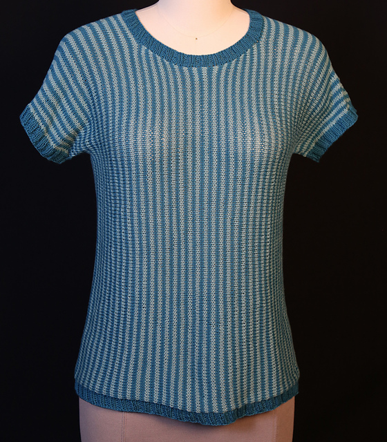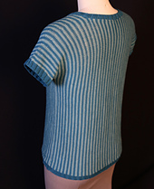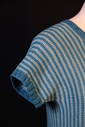 One of the benefits of knitting a sideways sweater is the possibility of vertical stripes. This Dotterel sweater showcases this technique beautifully by alternating two colors every other row in simple stockinette throughout. It's created with minimal shaping—just some increases at the neck and decreases at the shoulders and sleeves. And as with most of my knitting designs, no seaming with a tapestry needle is needed. The sweater has a fun construction that will keep you interested and moving along each step of the way.